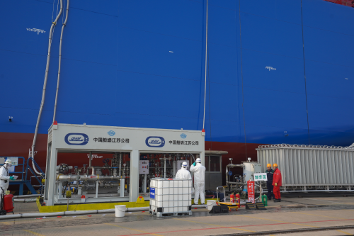 12月26日,中国船燃江苏公司在扬州中远海运重工有限公司为其承建的国内首制16000TEU甲醇双燃料集装箱船成功加注甲醇燃料150吨。这是国内首次成功为国产大型双燃料集装箱船加注甲醇。 该16000TEU甲醇双燃料集装箱船是国内第一艘甲醇双燃料大型箱船,是中远海运集团为满足绿色航运走廊需求,搭建绿色甲醇产业链的重要一环。甲醇燃料的成功加注不仅验证了中远海运在甲醇燃料供应系统技术上的成熟,也为我国航运业的绿色转型提供了有力支持。 此次加注作业加注距离长度80米、作业高度近40米。为保障本次加注作业顺利开展,中国船燃江苏公司与扬州中远海运重工深度协同,提前进行了充分的准备,组织编制了国内首个针对大型集装箱船的“码头槽车方式甲醇加注设计方案”并获得中国船级社颁发原则性认可证书。 中国船燃江苏公司与扬州中远海运重工有限公司根据加注现场实际情况进行了充分沟通,共同编制《16000TEU甲醇双燃料集装箱船甲醇燃料加注安全评估报告》和《16000TEU甲醇双燃料集装箱船甲醇燃料加注方案及安全策划》,从而确保甲醇加注现场作业符合安全规程。加注作业前,作业人员参加了安全培训,对加注流程进行了预演,并对加注过程中甲醇泄漏环节进行了应急处置演练。加注过程中,现场作业人员严格按照操作规程,对甲醇燃料从槽车到船舶燃料舱的全过程严格把关,确保了加注的安全高效。 此次加注甲醇燃料的16000TEU甲醇双燃料动力集装箱船是国内第一艘甲醇双燃料动力大型集装箱船,船舶能效设计指数(EEDI)达到国际海事组织(IMO)第三阶段标准,可减少约8.9%的碳排放,比基准线低52.8%。船上配备中国船舶集团有限公司旗下中船动力(集团)有限公司研制的国内首台套拥有自主知识产权的甲醇双燃料低速机,与传统主机相比可最多减少50%的氮氧化物、97%的硫氧化物、90%的颗粒物和11%温室气体的排放。